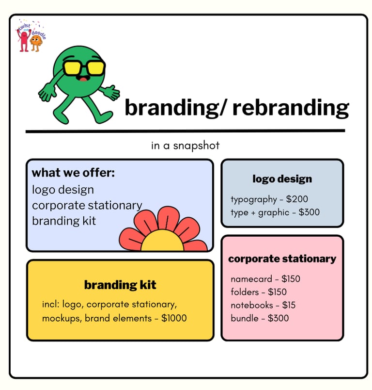 at Twist & Doodle, we understand that your brand is more than just a logo; it’s the essence of your business. whether you’re starting from scratch or looking to refresh your existing brand, our branding and rebranding services are designed to capture your unique identity and values. we’ll work closely with you to create a cohesive brand image that resonates with your target audience, sets you apart from the competition, and communicates your story effectively. ready to transform your brand? fill in the contact form below!